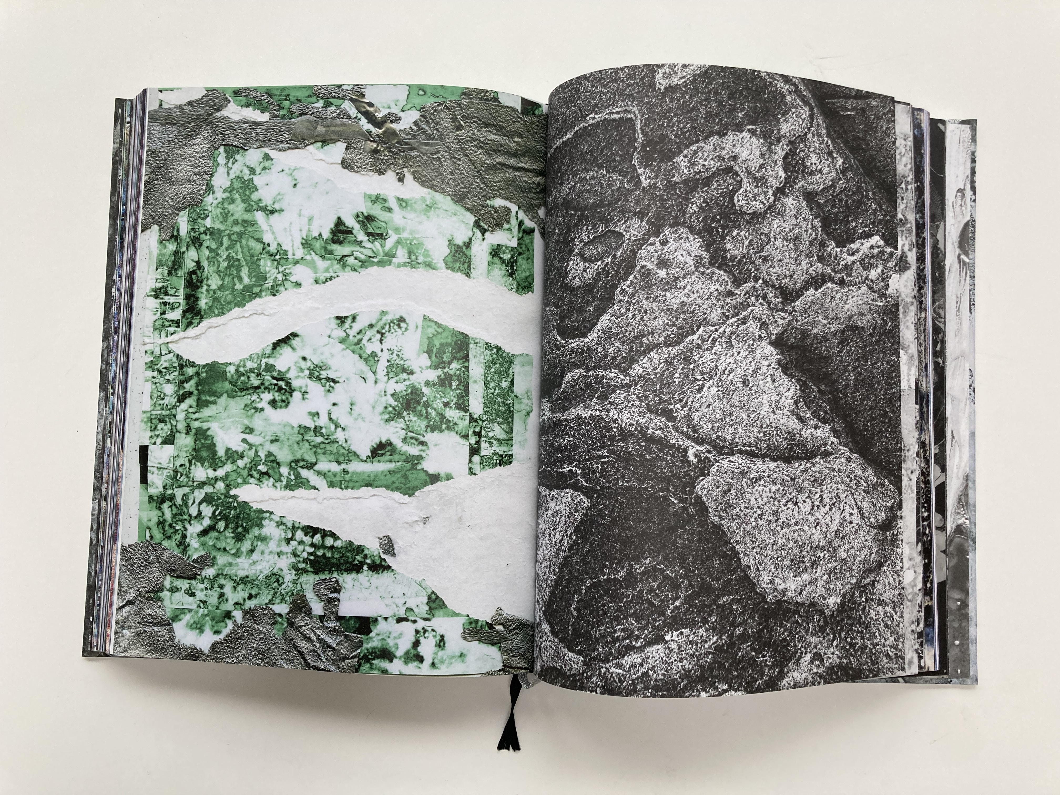 A Rock is a River blends photography and painting to create organic patterns, chromatic shifts, and visual ruptures. This ongoing process of transformation reflects a world in constant flux. Drawing from my photographic work, I’ve woven together images in various scales and rhythms, creating a collage that unfolds throughout the book. By challenging conventional ideas of what a "photograph" should be, I immerse myself in a synesthetic process, where painting, collage, and photography merge seamlessly. The images are layered both digitally and manually, and the layout itself becomes an integral part of the work, incorporating experimentation with printing techniques.