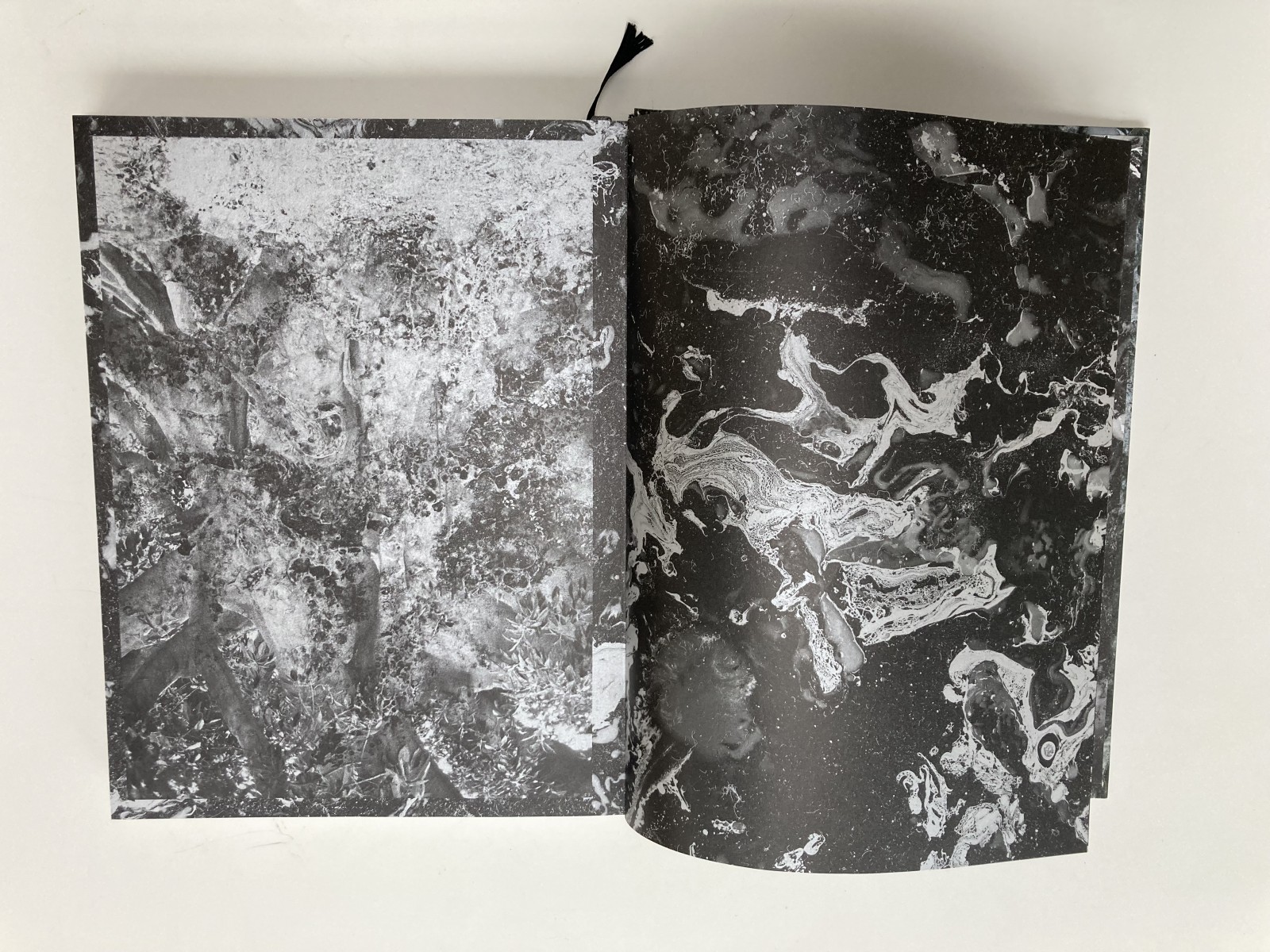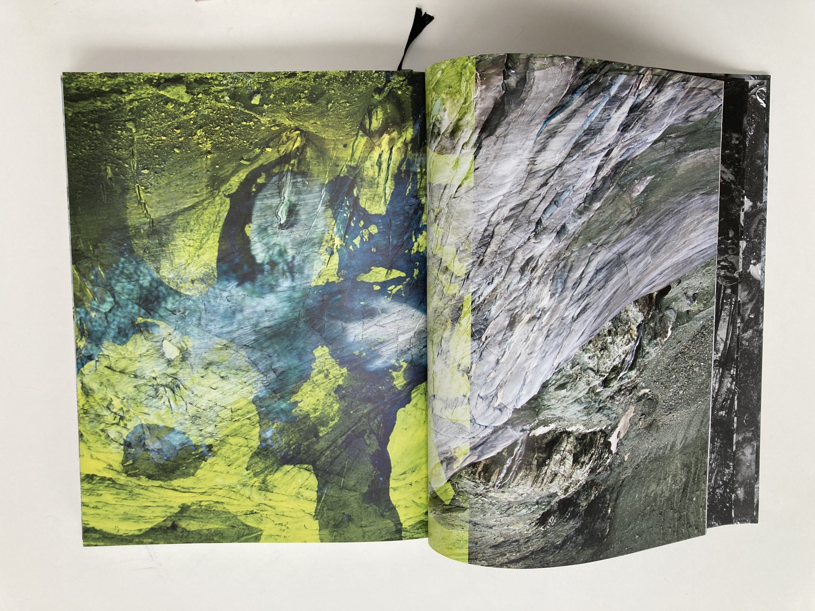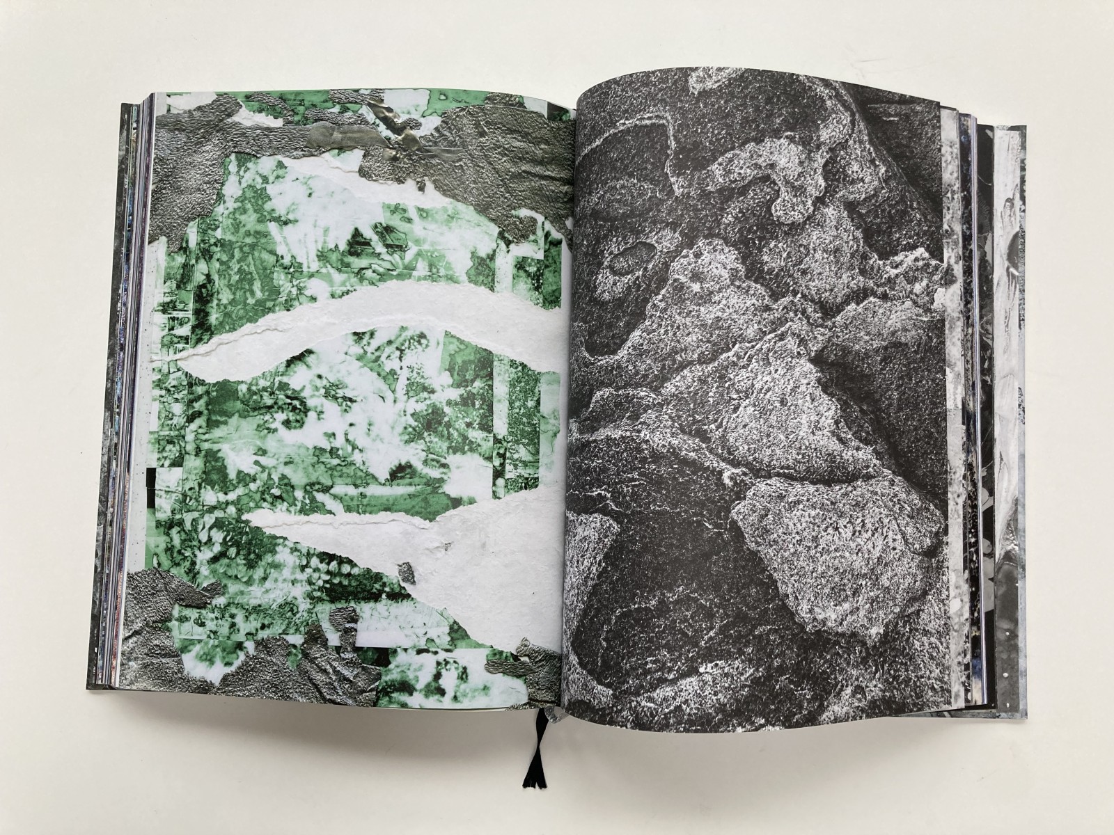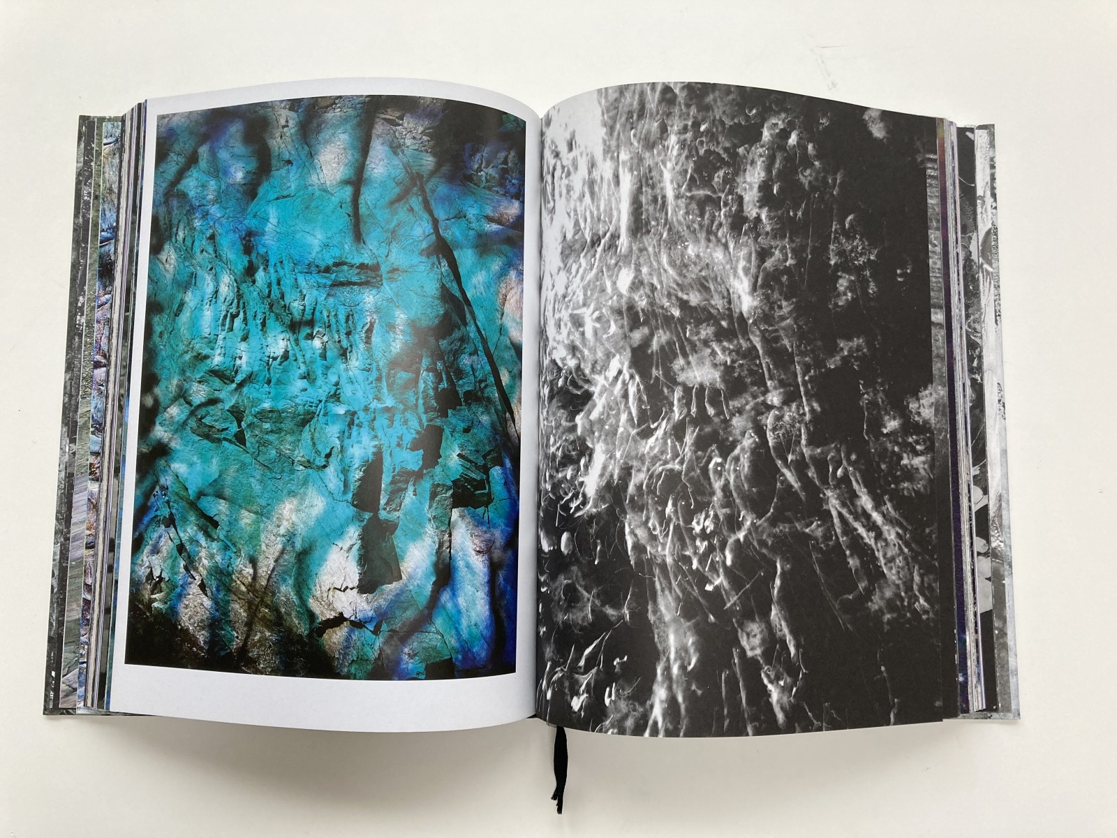 The title, A Rock is a River, reflects the raw material I collected to create the book, much of it shot in the Valle Verzasca in Switzerland and in other landscapes that hold personal significance, such as Peru, where my father lives. Inspired by the transformation of matter in nature—the sculpting forces of water, rocks reshaped by rivers, solids turning to liquids and back again—I apply similar processes of change and layering to my own work. The book has no text and no fixed order, allowing the reader to navigate the images without a conventional beginning or end. Printed in both color and black and white on silver paper, the pages interact with light, creating physical ruptures that activate the work in a dynamic, ever-changing way.