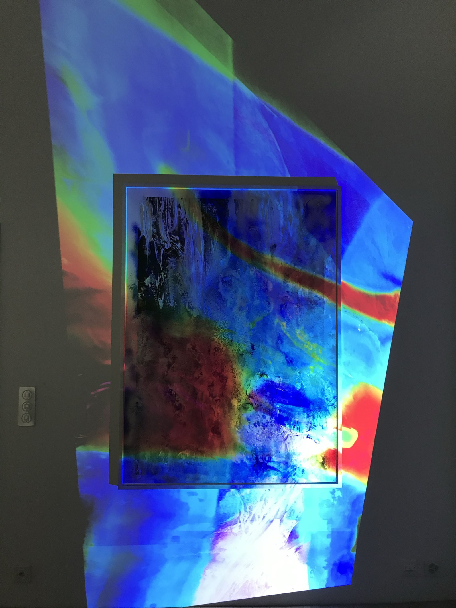 160x117cm, impression jet d’encre sur papier métallisé, rehaussé spray, encadré sous-verre antireflet, avec video loop ARRESTING FRAGMENTS OF THE WORLD, 4min 08, 20217