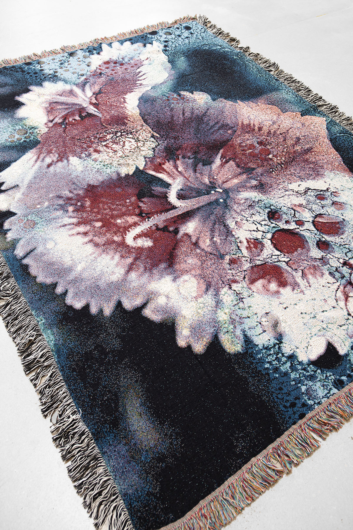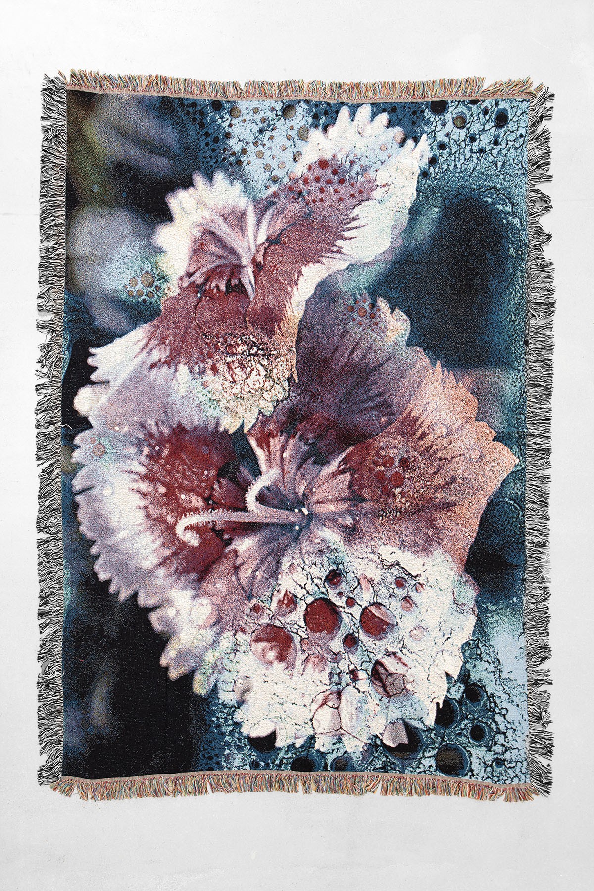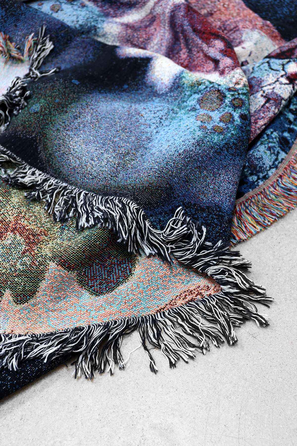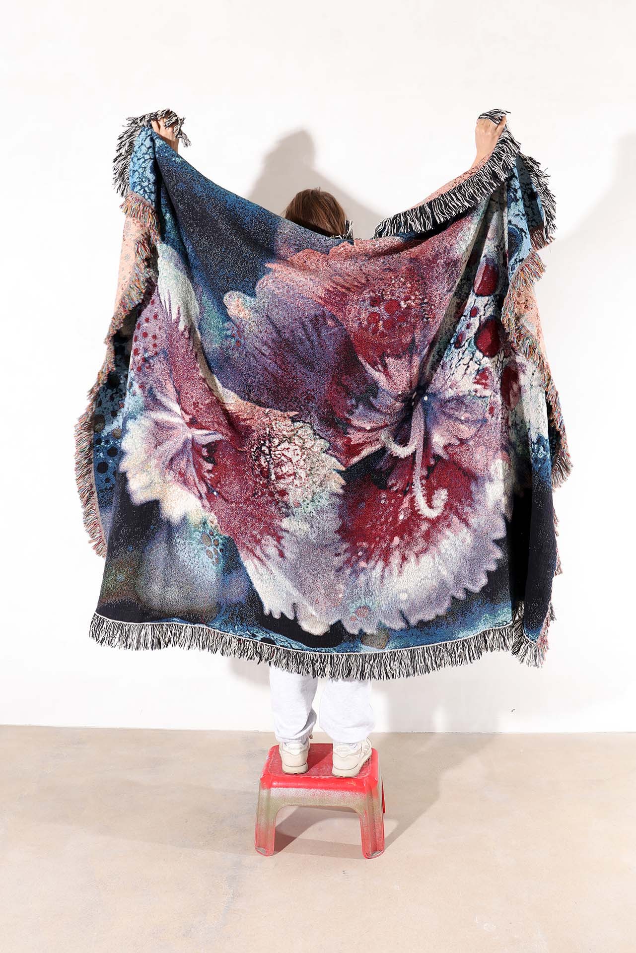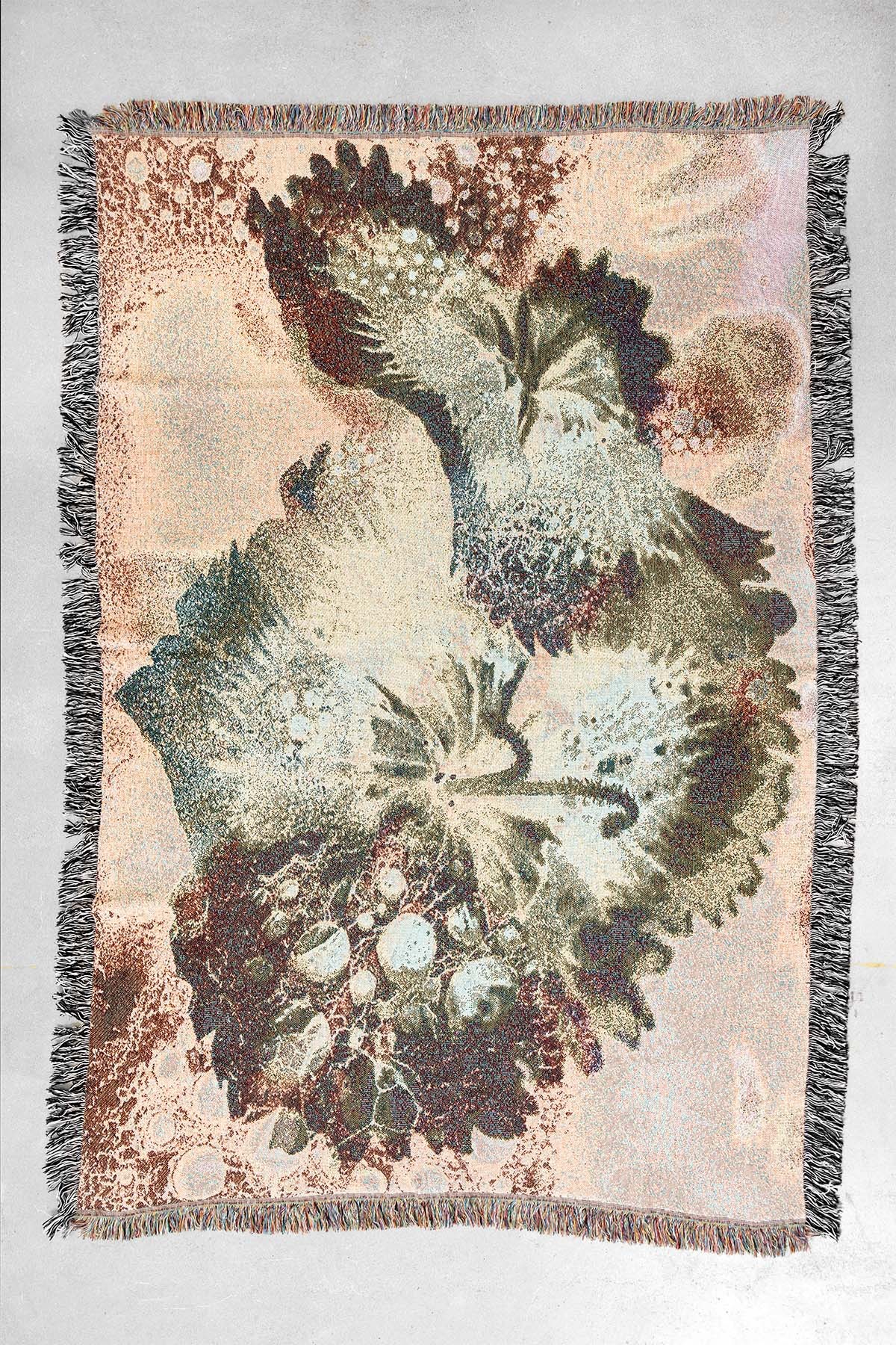 Ces couvertures en coton sont inspirées par mon amour des textiles et des matériaux organiques. À travers le tissage, mes images originales sont transformées et traduites dans une palette de couleurs plus douces, créant une atmosphère confortable et adaptée aux intérieurs.