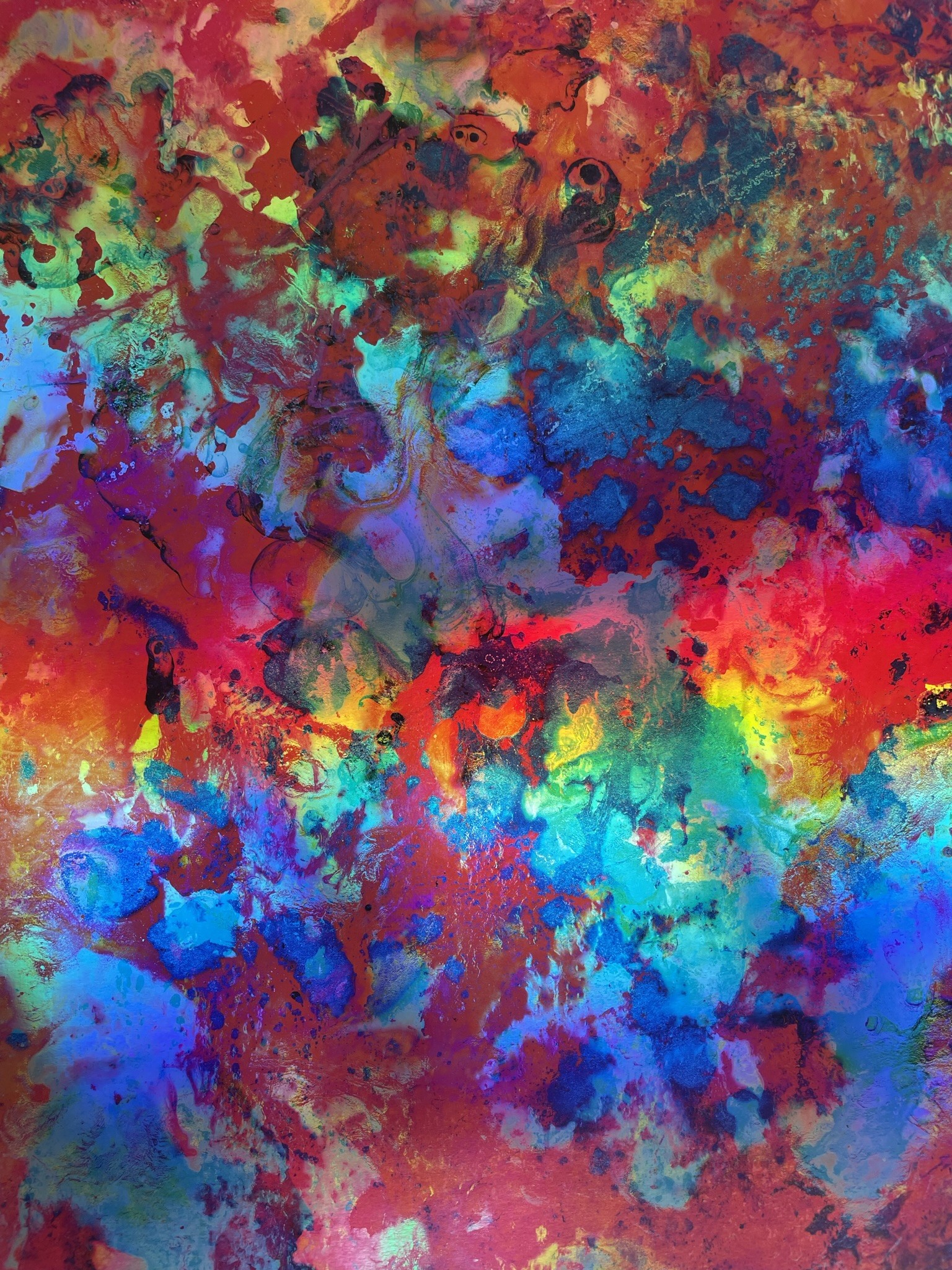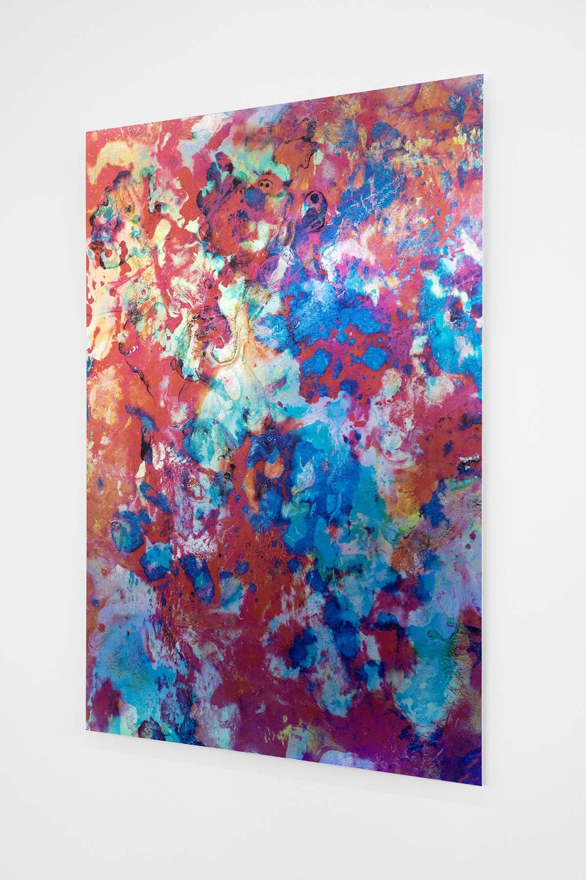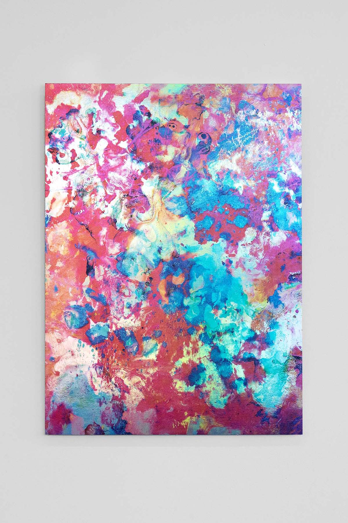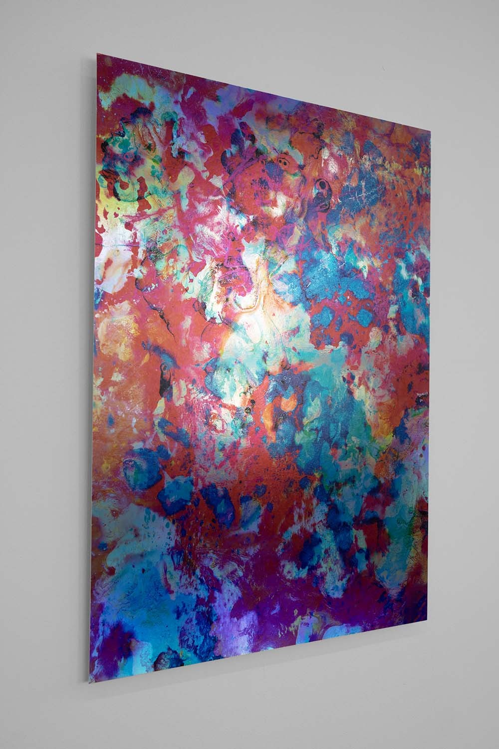 Cherchant à représenter des images multidimensionnelles et délibérément spectaculaires, évoquant des galaxies et d'autres nuages interstellaires, la série GALACTIC EVOLUTION est imprimée sur un laminate holographique, ce qui polarise les couleurs et crée des effets brillants.
