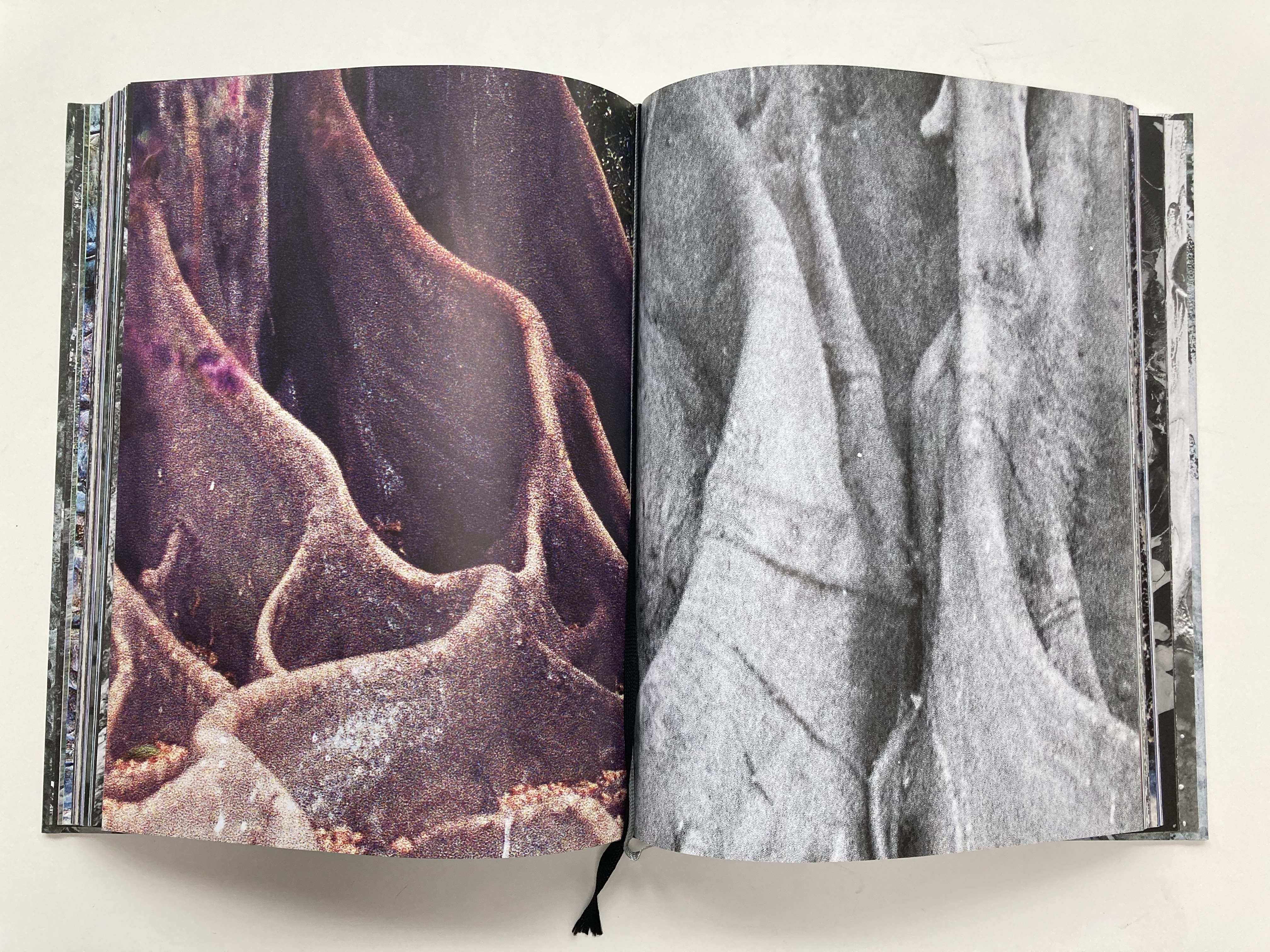 The title, A Rock is a River, reflects the raw material I collected to create the book, much of it shot in the Valle Verzasca in Switzerland and in other landscapes that hold personal significance, such as Peru, where my father lives. Inspired by the transformation of matter in nature—the sculpting forces of water, rocks reshaped by rivers, solids turning to liquids and back again—I apply similar processes of change and layering to my own work. The book has no text and no fixed order, allowing the reader to navigate the images without a conventional beginning or end. Printed in both color and black and white on silver paper, the pages interact with light, creating physical ruptures that activate the work in a dynamic, ever-changing way.