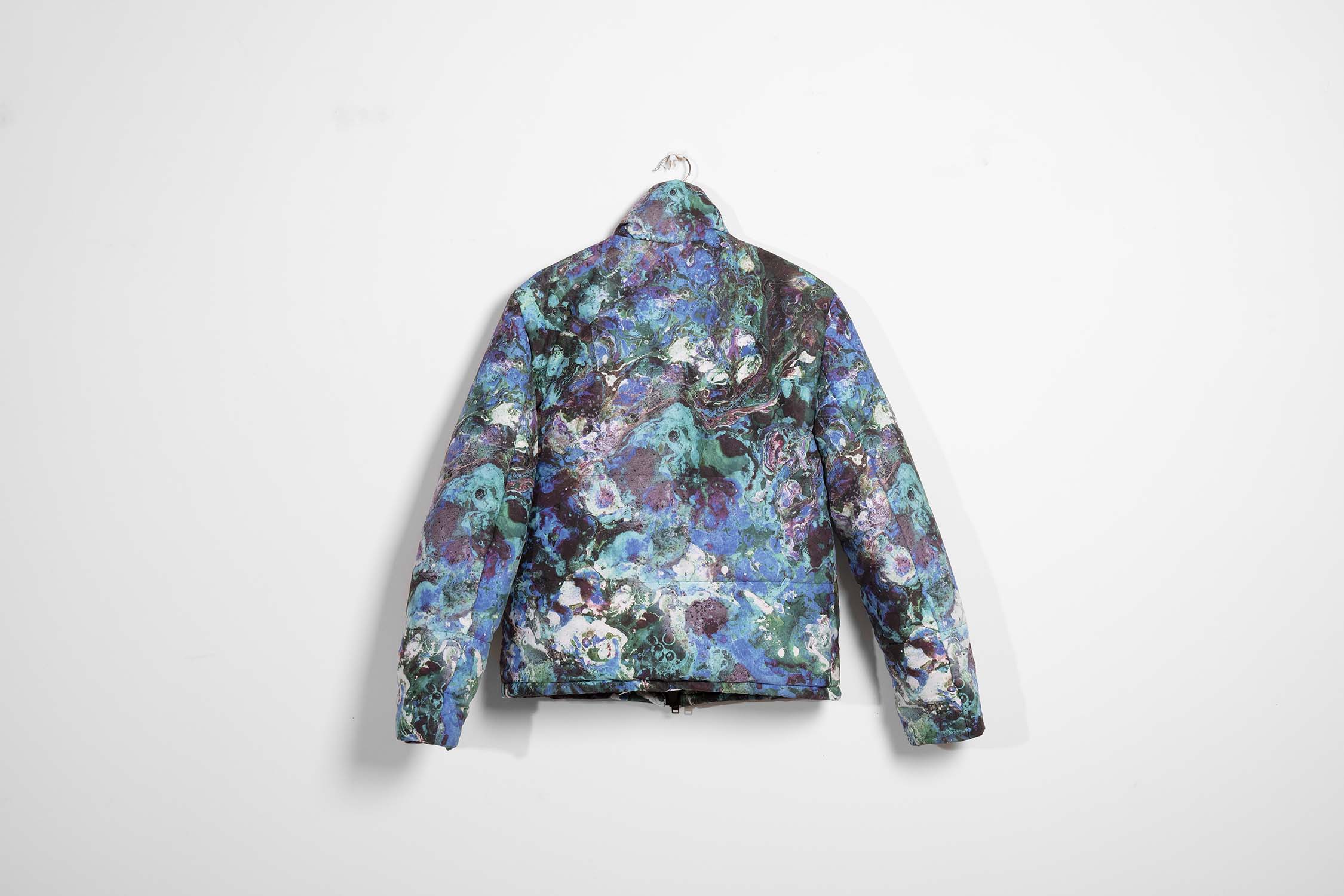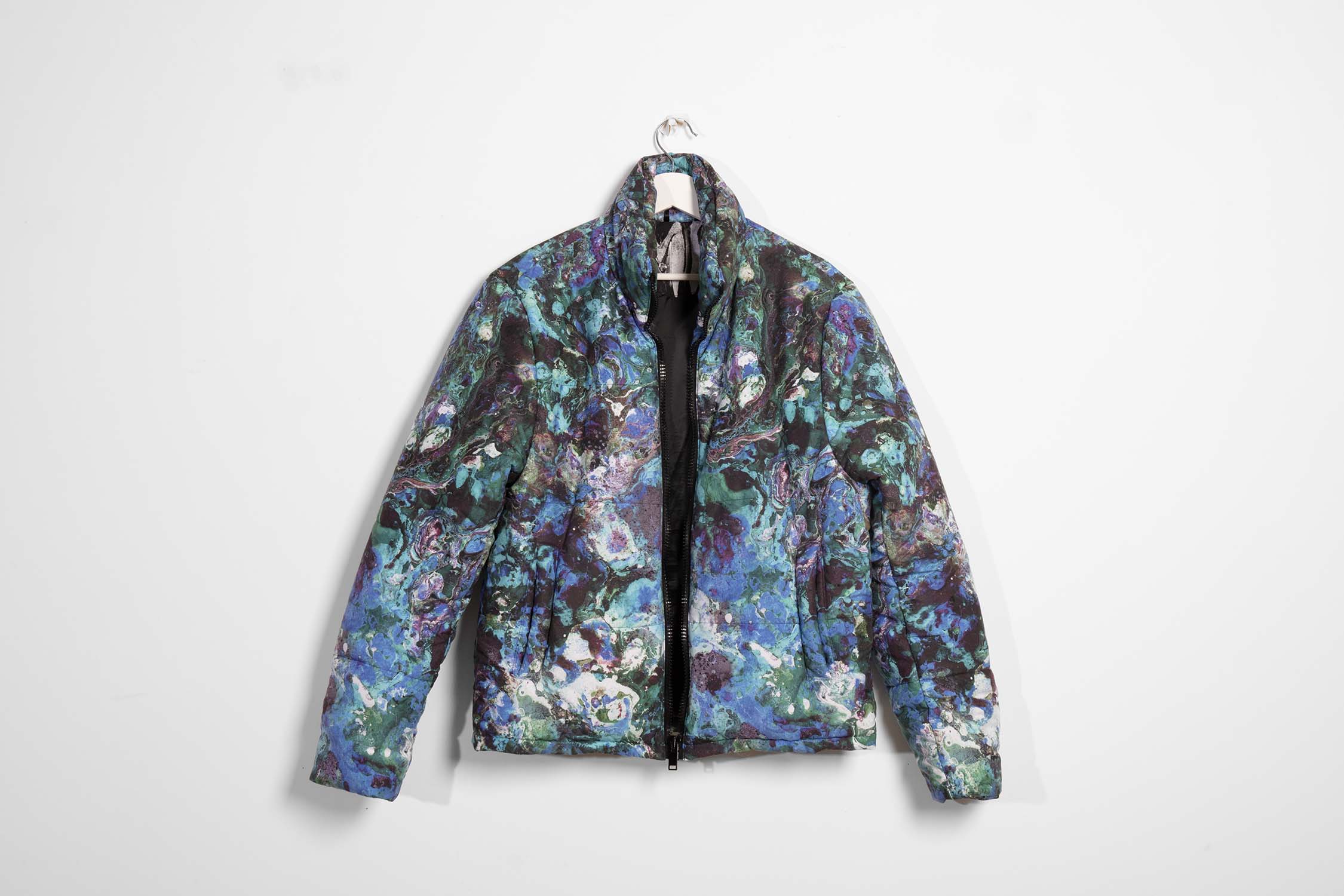 Crafted from high-quality, sustainable materials, this custom puffer jacket offers you the chance to stand out from the greyness of winter. Made from water repellent soft touch recycled Nautica fabric, constructed with THERMORE® recycled filling materials made from 100% post consumer plastic bottles. Fleece lined side pockets and an inside pocket, high quality, light and durable zip closure. Support your local artist, make a unique statement and keep warm with this MR jacket.