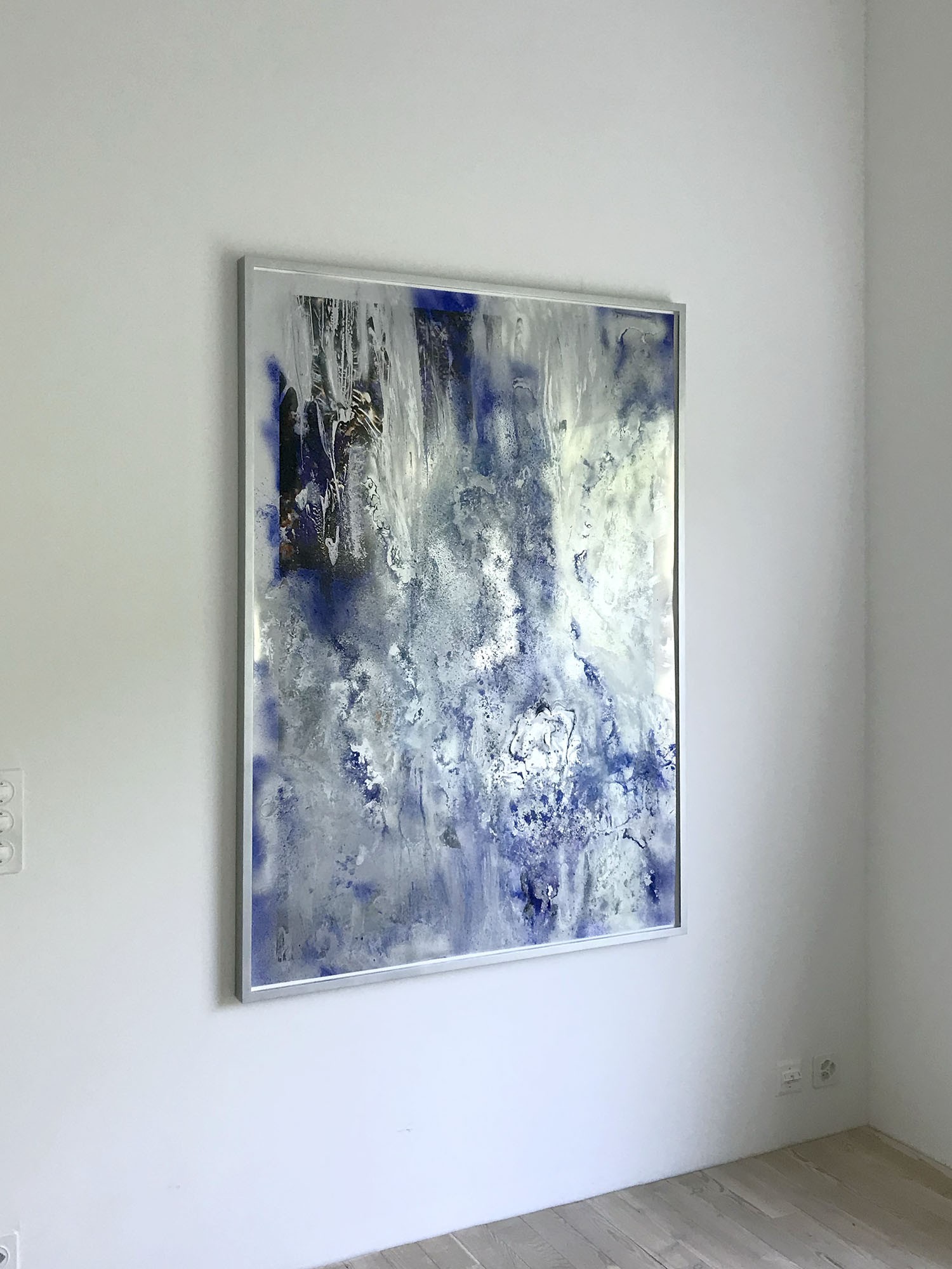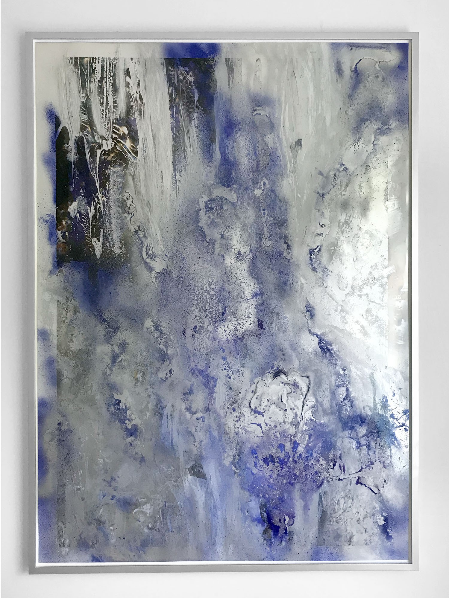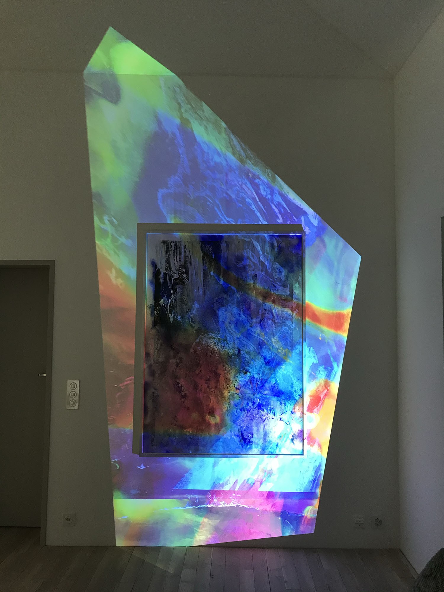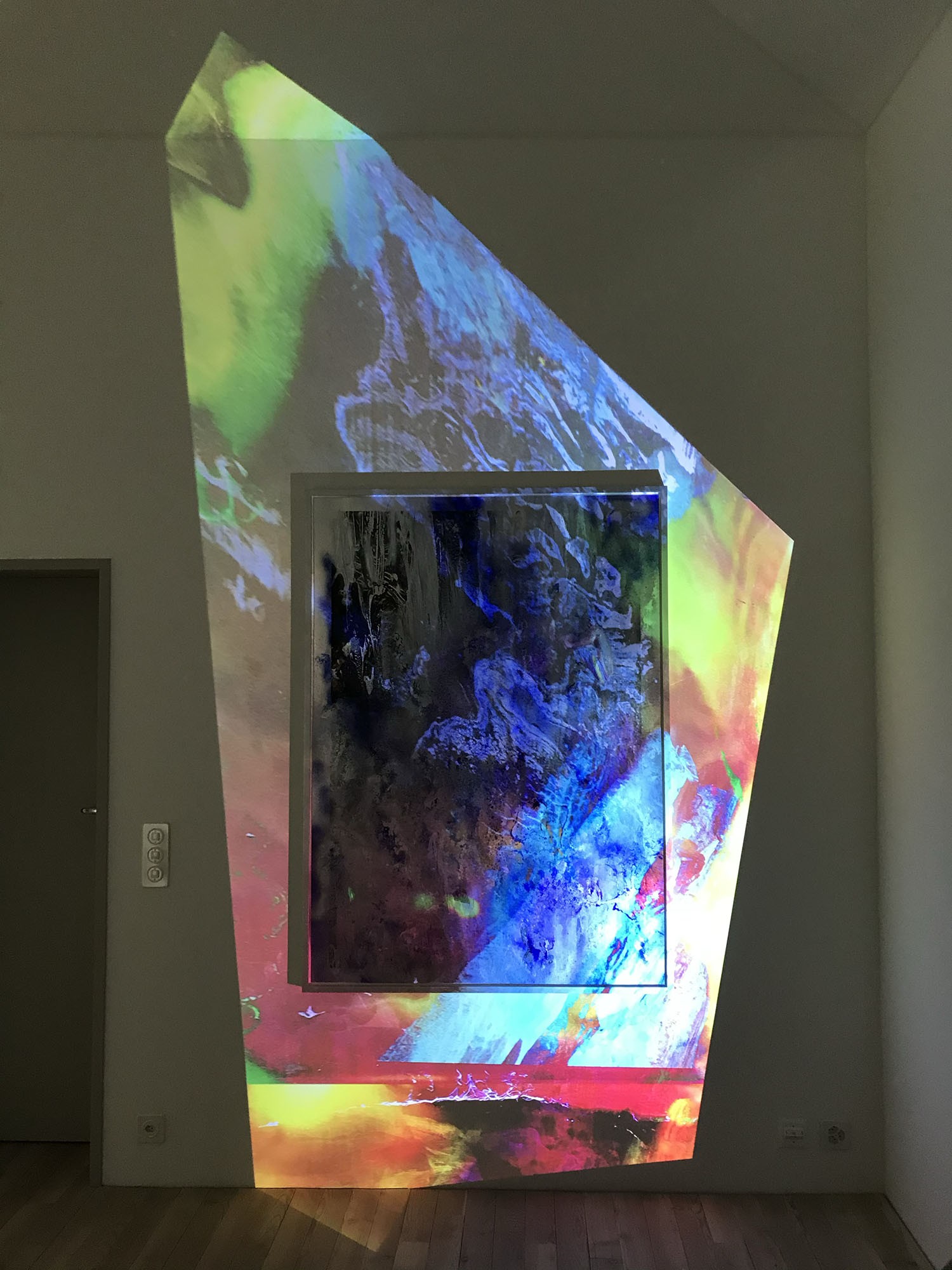 160x117cm, impression jet d’encre sur papier métallisé, rehaussé spray, encadré sous-verre antireflet, avec video loop ARRESTING FRAGMENTS OF THE WORLD, 4min 08, 20217