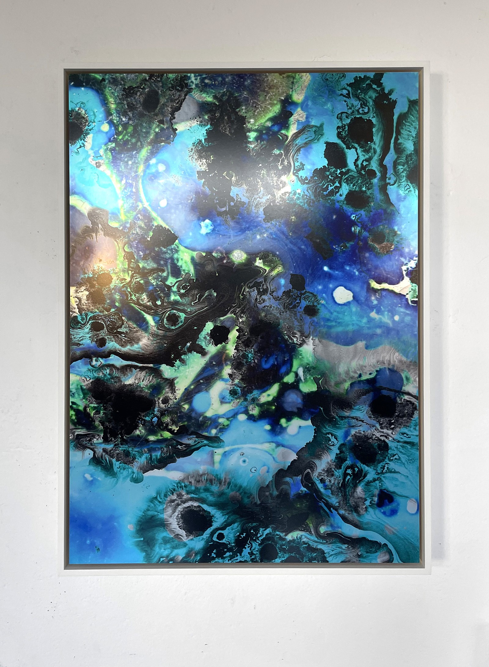 50 x 70 cm, inkjet print on silver paper, on alu dibond, american frame on wallpaper, 2025