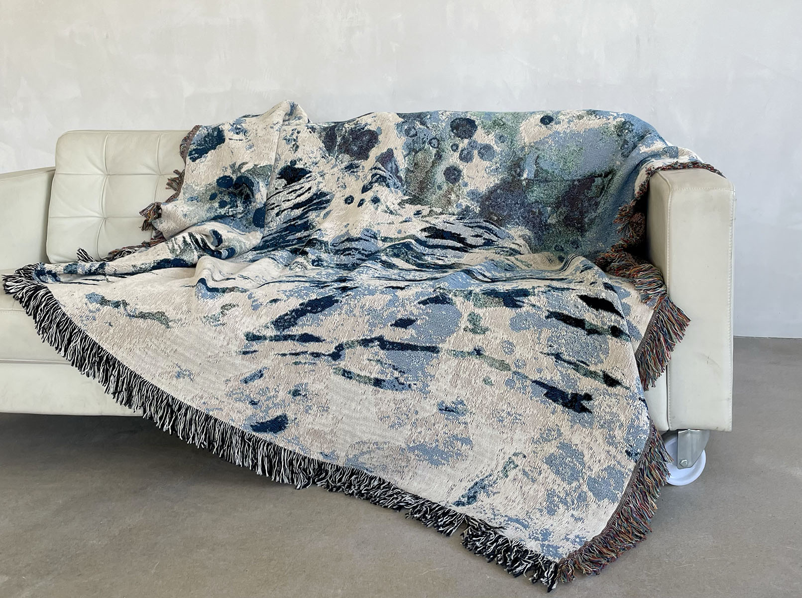 Ces couvertures en coton sont inspirées par mon amour des textiles et des matériaux organiques. À travers le tissage, mes images originales sont transformées et traduites dans une palette de couleurs plus douces, créant une atmosphère confortable et adaptée aux intérieurs.